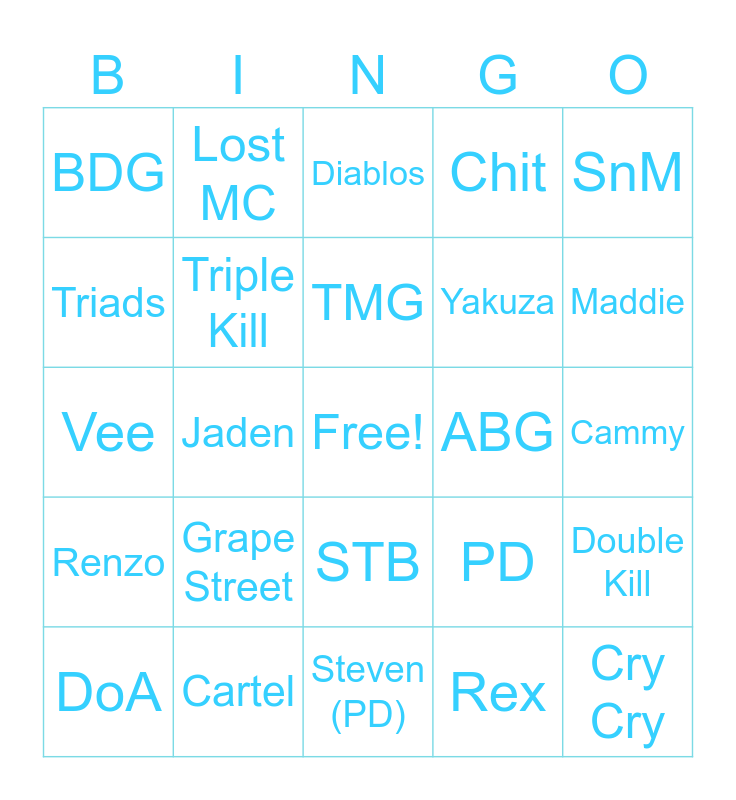 This bingo card has a free space and 24 words: Grape Street, Cartel, TMG, DoA, SnM, BDG, Triads, Lost MC, ABG, STB, Yakuza, Vee, PD, Double Kill, Triple Kill, Rex, Cammy, Diablos, Maddie, Jaden, Cry Cry, Renzo, Chit and Steven (PD).