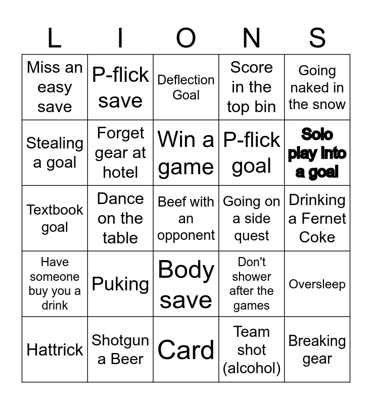 This bingo card has a free space and 31 words: Card, Being hungover for a game, Dance on the table, Miss an open goal, Miss an easy save, Deflection Goal, Forget gear at hotel, Don't shower after the games, Going on a side quest, Team shot (alcohol), Drinking a Fernet Coke, Breaking gear, No winter clothes, Reaally Blunder pass, Solo play into a goal, Sing karaoke, Oversleep, Puking, Have someone buy you a drink, Body save, Going naked in the snow, Spill a drink, Hattrick, P-flick save, P-flick goal, Stealing a goal, Score in the top bin, Textbook goal, Shotgun a Beer, Win a game and Score 6-7 goals in a game.