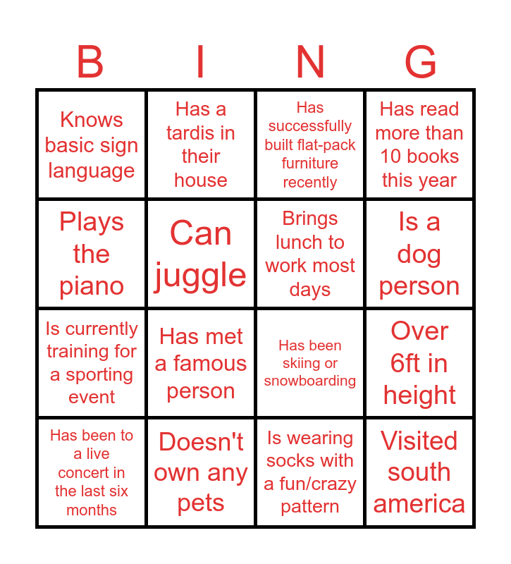 This bingo card has 33 words: Free!, Speaks french, Over 6ft in height, Has a mustache, Visited south america, Brings lunch to work most days, Plays the piano, Plays guitar, Has a tardis in their house, Is a cat person, Is a dog person, Has successfully built flat-pack furniture recently, Is the youngest sibling, Has more than 3 siblings, Doesn't own any pets, Has met a famous person, Wakes up before 6:00 AM, Has been skiing or snowboarding, Walks or bikes to work, Has never broken a bone, Has a tattoo, Has a birthday in the same month as you, Knows basic sign language, Is wearing socks with a fun/crazy pattern, Can whistle loudly, Has been to a live concert in the last six months, Has read more than 10 books this year, Is currently training for a sporting event, Can juggle, Hates the taste of coffee, Knows how to knit or crochet, Has a name with 5 or fewer letters and Has finished a video game in the last 6 months.