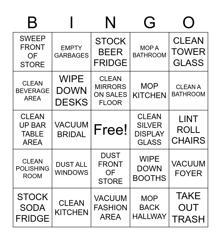 This bingo card has a free space and 24 words: DUST ALL WINDOWS, CLEAN KITCHEN, CLEAN MIRRORS ON SALES FLOOR, STOCK SODA FRIDGE, CLEAN TOWER GLASS, SWEEP FRONT OF STORE, CLEAN BEVERAGE AREA, EMPTY GARBAGES, CLEAN SILVER DISPLAY GLASS, DUST FRONT OF STORE, MOP KITCHEN, CLEAN UP BAR TABLE AREA, WIPE DOWN BOOTHS, VACUUM FOYER, WIPE DOWN DESKS, MOP BACK HALLWAY, LINT ROLL CHAIRS, STOCK BEER FRIDGE, CLEAN A BATHROOM, VACUUM BRIDAL, TAKE OUT TRASH, CLEAN POLISHING ROOM, MOP A BATHROOM and VACUUM FASHION AREA.