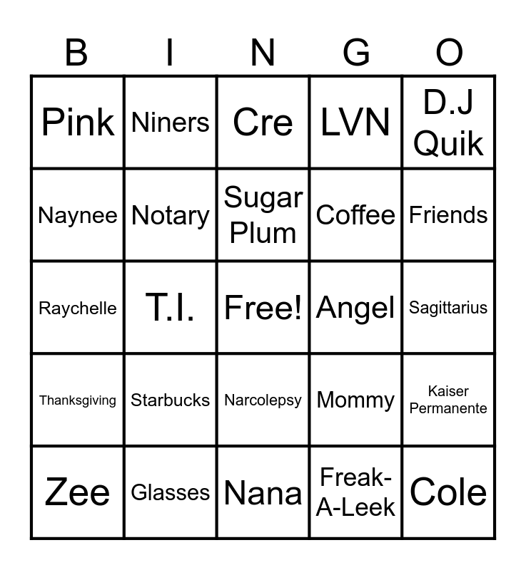This bingo card has a free space and 51 words: 49, Cole, Ari, Nana, Starbucks, November, Niners, Bublin_Brwn_Suga, Naynee, Love I, Notary, LVN, Kaiser Permanente, Mommy, Fury, Maxi Pad, Sugar Plum, Angel, Gracie, D.J Quik, T.I., Freak-A-Leek, Pink, Coffee, Popcorn, Concerts, Friends, Chay, Zee, Cre, Kay, Church, Online Shopping, Fragrances, Shoes, Glasses, CAMS, Compton, Mary, Cole, Sagittarius, Thanksgiving, The Jaguar, Extra-spectacular, Parmelee, 126th, Raychelle, Tacoldee, Scrubs, Narcolepsy and Girl Mom.