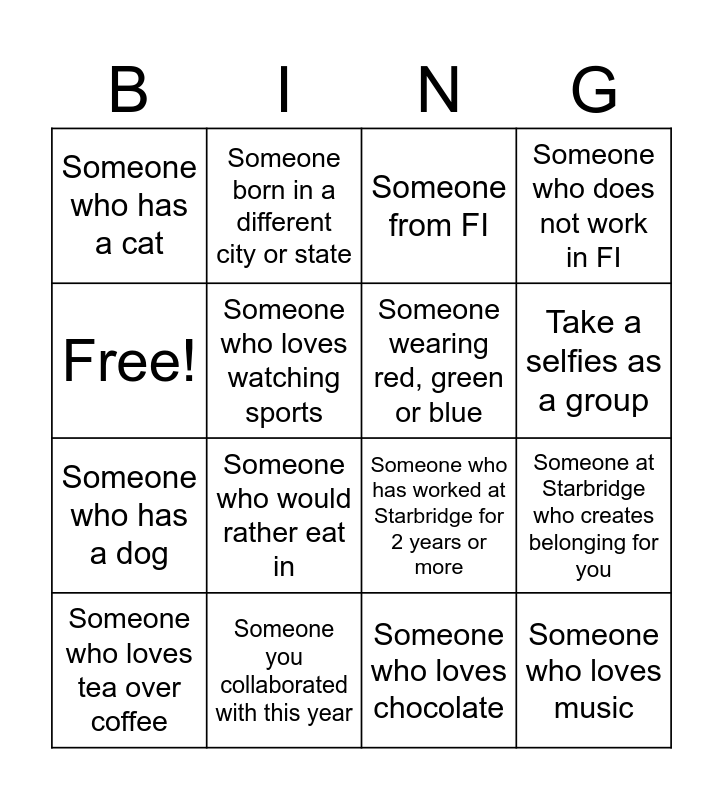 This bingo card has 16 words: Someone you collaborated with this year, Someone at Starbridge who creates belonging for you, Someone from FI, Someone who has a cat, Someone who has a dog, Someone born in a different city or state, Someone who has worked at Starbridge for 2 years or more, Someone who loves chocolate, Free!, Someone who loves watching sports, Someone who loves tea over coffee, Someone who does not work in FI, Someone who would rather eat in, Take a selfies as a group, Someone wearing red, green or blue and Someone who loves music.