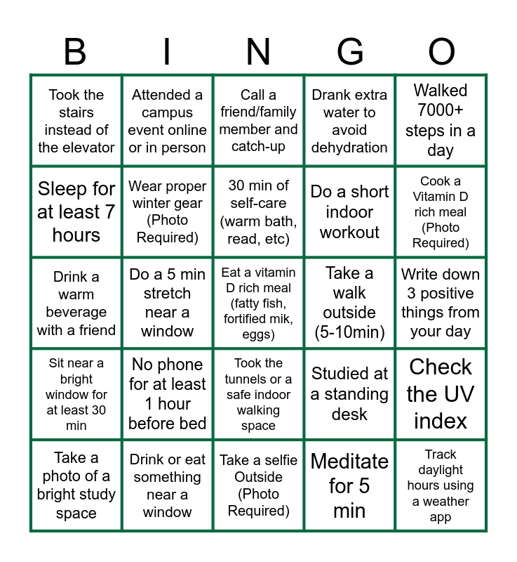 This bingo card has 25 words: Sit near a bright window for at least 30 min, Drink or eat something near a window, Eat a vitamin D rich meal (fatty fish, fortified mik, eggs), Meditate for 5 min, Walked 7000+ steps in a day, Took the stairs instead of the elevator, Attended a campus event online or in person, Call a friend/family member and catch-up, Take a walk outside (5-10min), Check the UV index, Sleep for at least 7 hours, Wear proper winter gear (Photo Required), Take a selfie Outside (Photo Required), Studied at a standing desk, Cook a Vitamin D rich meal (Photo Required), Take a photo of a bright study space, Do a 5 min stretch near a window, 30 min of self-care (warm bath, read, etc), Do a short indoor workout, Write down 3 positive things from your day, Drink a warm beverage with a friend, No phone for at least 1 hour before bed, Took the tunnels or a safe indoor walking space, Drank extra water to avoid dehydration and Track daylight hours using a weather app.