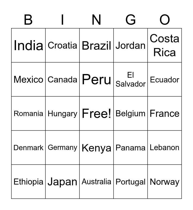 This bingo card has a free space and 70 words: Argentina, Australia, Austria, Bangladesh, Belgium, Bolivia, Brazil, Bulgaria, Canada, Chile, China, Colombia, Costa Rica, Croatia, Czech Republic, Denmark, Dominican Republic, Ecuador, Egypt, El Salvador, Ethiopia, Finland, France, Germany, Ghana, Greece, Guatemala, Honduras, Hungary, Iceland, India, Indonesia, Iran, Iraq, Ireland, Israel, Italy, Jamaica, Japan, Jordan, Kazakhstan, Kenya, Lebanon, Libya, Malaysia, Mexico, Morocco, Nepal, Netherlands, New Zealand, Nicaragua, Nigeria, Norway, Pakistan, Panama, Paraguay, Peru, Philippines, Poland, Portugal, Romania, Russia, Saudi Arabia, South Africa, South Korea, Spain, Sweden, Switzerland, Thailand and Turkey.