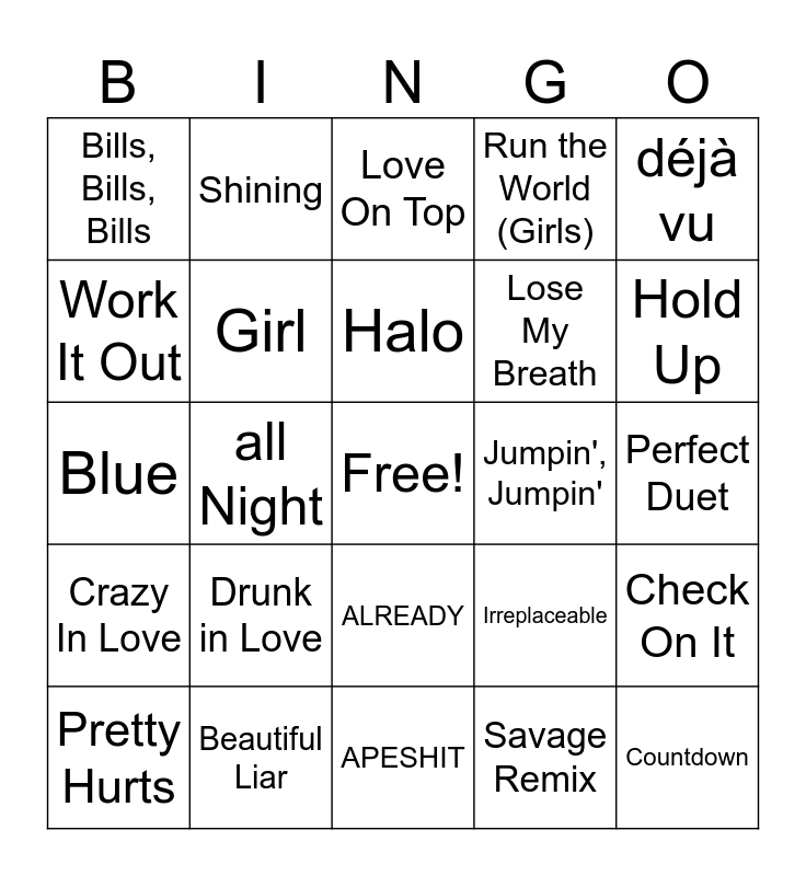 This bingo card has a free space and 62 words: 03 Bonie & Clyde, Beautiful Liar, Best Thing I Never Had, Crazy In Love, Daddy Lessons, Freedom, Girl, Lift Off, Lose My Breath, Ring The Alarm, Run the World (Girls), Video Phone, Work It Out, 6 Inch, Be Alive, Bills, Bills, Bills, Countdown, déjà vu, Formation, Halo, Jumpin', Jumpin', Love On Top, Pretty Hurts, Savage Remix, Upgrade, XO, Baby Boy, BLACK PARADE, Check On It, Diva, ***Flawless, Heaven, Jealous, Mi Gente, Perfect Duet, Shining, Telephone, 7/11, all Night, At Last, Blue, Bug a Boo, Drunk in Love, FIND YOUR WAY BACK, Hold Up, Irreplaceable, Mine, Partition, Single Ladies, Survivor, ALREADY, APESHIT, Bootylicious, BROWN SKIN GIRL, Emotion, Feeling myself, If I Were a Boy, Independent Women , Pt.1, Naughty Girl, No, No, No Pt. 2, Soldier and Sorry.