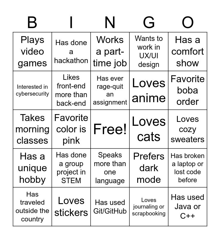 This bingo card has a free space and 46 words: Has coded in Python, Has used Java or C++, Has built a website, Has used Git/GitHub, Has done a group project in STEM, Wants to work in software engineering, Has done a hackathon, Has used Visual Studio Code, Interested in cybersecurity, Wants to learn data science, Likes front-end more than back-end, Wants to work in UX/UI design, Has broken a laptop or lost code before, Prefers dark mode, Uses multiple monitors to work, Has done a coding project for fun, Has ever rage-quit an assignment, Loves cats, Loves dogs, Has a comfort show, Favorite color is pink, Loves journaling or scrapbooking, Plays video games, Loves anime, Listens to music while studying, Favorite boba order, Has traveled outside the country, Can cook or bake, Speaks more than one language, Has a unique hobby, Loves reading, Collects something (keyboards, pins, etc.), Has cried over a math class, Has dropped their laptop before, Gets boba at least once a week, Loves stickers, Loves cozy sweaters, Takes aesthetic notes, Has a favorite keyboard sound, Has accidentally sent a message to the wrong group chat, Part of another student org, Works a part-time job, Takes morning classes, Commutes to campus, Has pulled an all-nighter before and Has changed majors.