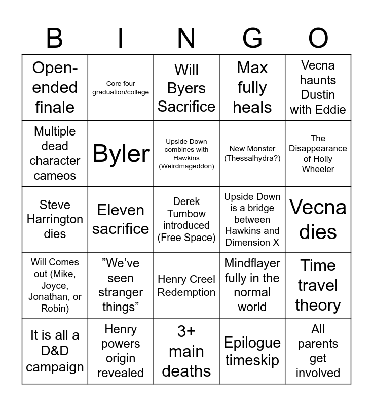 This bingo card has a free space and 24 words: ”We’ve seen stranger things”, Henry powers origin revealed, Upside Down combines with Hawkins (Weirdmageddon), It is all a D&D campaign, Vecna haunts Dustin with Eddie, Open-ended finale, Multiple dead character cameos, Core four graduation/college, Upside Down is a bridge between Hawkins and Dimension X, Henry Creel Redemption, New Monster (Thessalhydra?), Steve Harrington dies, Mindflayer fully in the normal world, Time travel theory, Byler, Epilogue timeskip, Vecna dies, Will Byers Sacrifice, The Disappearance of Holly Wheeler, Eleven sacrifice, All parents get involved, Will Comes out (Mike, Joyce, Jonathan, or Robin), Max fully heals and 3+ main deaths.