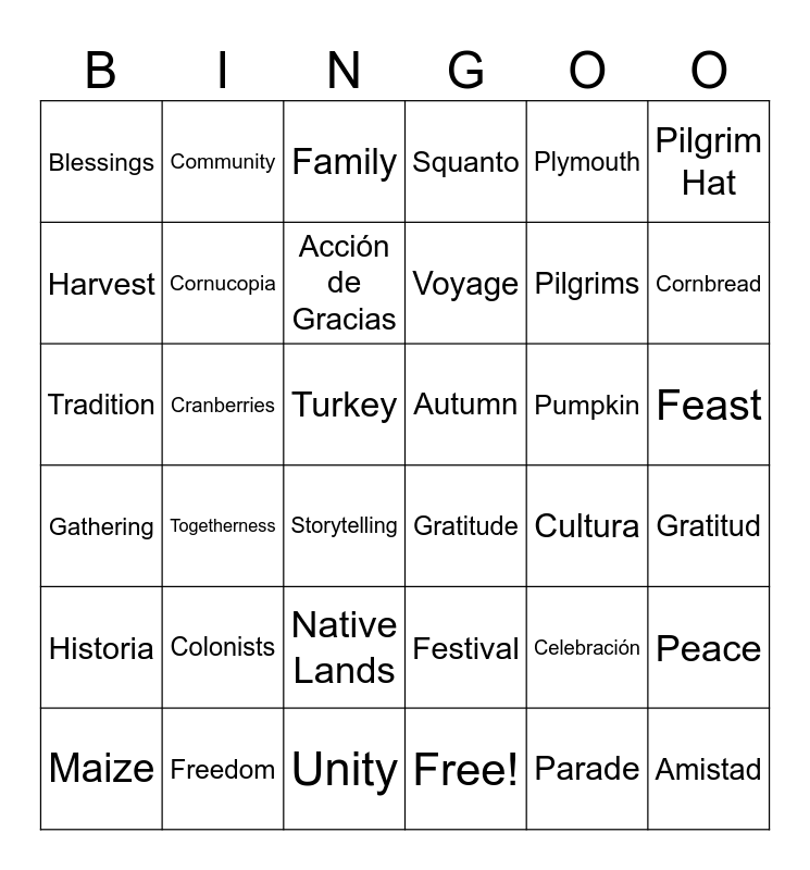This bingo card has 41 words: Free!, Pilgrims, Wampanoag, Harvest, Gratitude, Feast, Cornucopia, Mayflower, Plymouth, Autumn, Cornbread, Squanto, Tradition, Turkey, Cranberries, Pumpkin, Maize, Blessings, Parade, Family, Togetherness, Historia, Cultura, Acción de Gracias, Amistad, Celebración, Gratitud, Indigenous, Voyage, Colonists, Sharing, Community, Storytelling, Freedom, Gathering, Pilgrim Hat, Native Lands, Peace, Unity, Festival and Thankfulness.