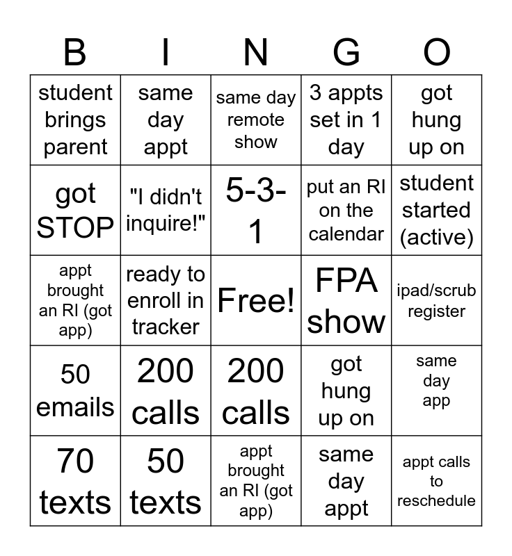 This bingo card has a free space and 24 words: 70 texts, 200 calls, 5-3-1, same day appt, got hung up on, student brings parent, same day appt, same day remote show, FPA show, ipad/scrub register, appt brought an RI (got app), "I didn't inquire!", got hung up on, same day app, got STOP, 50 texts, appt brought an RI (got app), 3 appts set in 1 day, student started (active), 50 emails, ready to enroll in tracker, 200 calls, put an RI on the calendar and appt calls to reschedule.