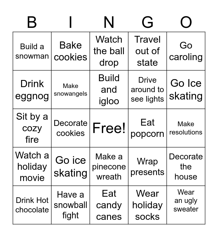 This bingo card has a free space and 24 words: Go ice skating, Have a snowball fight, Build and igloo, Drink Hot chocolate, Go caroling, Build a snowman, Drink eggnog, Bake cookies, Eat popcorn, Make a pinecone wreath, Drive around to see lights, Sit by a cozy fire, Wrap presents, Decorate the house, Make snowangels, Wear holiday socks, Make resolutions, Watch the ball drop, Go Ice skating, Decorate cookies, Wear an ugly sweater, Watch a holiday movie, Travel out of state and Eat candy canes.
