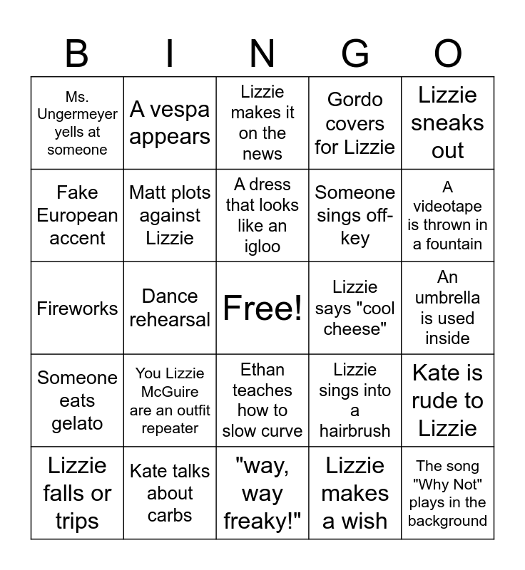 This bingo card has a free space and 24 words: You Lizzie McGuire are an outfit repeater, Kate talks about carbs, A dress that looks like an igloo, Lizzie falls or trips, Lizzie sneaks out, Ms. Ungermeyer yells at someone, Fake European accent, A vespa appears, Lizzie says "cool cheese", Ethan teaches how to slow curve, Someone sings off-key, Fireworks, Lizzie sings into a hairbrush, Kate is rude to Lizzie, Matt plots against Lizzie, Lizzie makes a wish, An umbrella is used inside, Lizzie makes it on the news, A videotape is thrown in a fountain, Dance rehearsal, The song "Why Not" plays in the background, Someone eats gelato, Gordo covers for Lizzie and "way, way freaky!".
