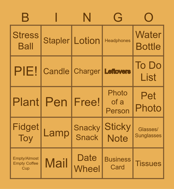 This bingo card has a free space and 29 words: Empty/Almost Empty Coffee Cup, Gum, Pen, Cell Phone, Stress Ball, Lotion, Candle, Lamp, Photo of a Person, Mail, Pet Photo, Tissues, Date Wheel, Business Card, To Do List, Calculator, Snacky Snack, Fidget Toy, Water Bottle, Plant, Sticky Note, Chapstick, Leftovers, PIE!, Headphones, Stapler, Glasses/ Sunglasses, Charger and Turkey.