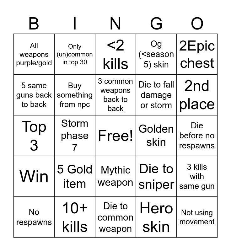 This bingo card has a free space and 24 words: 5 Gold item, 10+ kills, 3 common weapons back to back, No respawns, 2Epic chest, All weapons purple/gold, 5 same guns back to back, Only (un)common in top 30, Golden skin, Mythic weapon, Die to fall damage or storm, Top 3, Die to sniper, 3 kills with same gun, Buy something from npc, Hero skin, Die before no respawns, <2 kills, 2nd place, Storm phase 7, Not using movement, Win, Og (<season 5) skin and Die to common weapon.