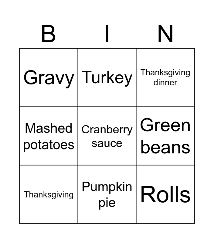 This bingo card has 9 words: Thanksgiving, Thanksgiving dinner, Turkey, Mashed potatoes, Gravy, Green beans, Cranberry sauce, Rolls and Pumpkin pie.