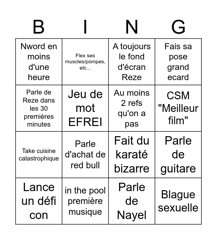 This bingo card has 16 words: in the pool première musique, Parle de guitare, A toujours le fond d'écran Reze, Nword en moins d'une heure, Take cuisine catastrophique, Flex ses muscles/pompes, etc..., Fait du karaté bizarre, Parle de Nayel, Parle de Reze dans les 30 premières minutes, Jeu de mot EFREI, Lance un défi con, Fais sa pose grand ecard, Parle d'achat de red bull, CSM "Meilleur film", Au moins 2 refs qu'on a pas and Blague sexuelle.