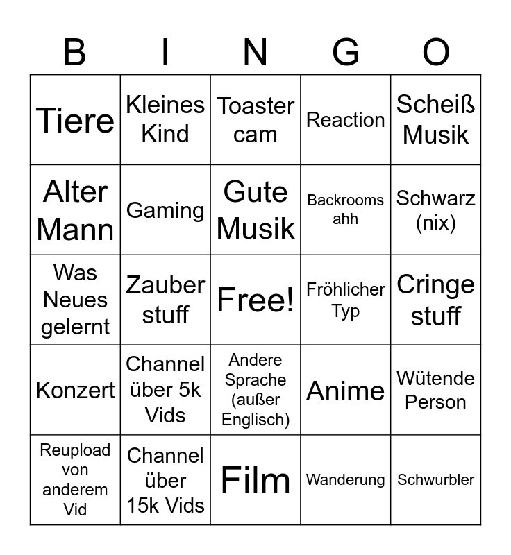 This bingo card has a free space and 24 words: Channel über 5k Vids, Channel über 15k Vids, Gute Musik, Reupload von anderem Vid, Scheiß Musik, Tiere, Alter Mann, Kleines Kind, Fröhlicher Typ, Andere Sprache (außer Englisch), Backrooms ahh, Was Neues gelernt, Anime, Wütende Person, Gaming, Wanderung, Cringe stuff, Toaster cam, Schwarz (nix), Zauber stuff, Schwurbler, Konzert, Reaction and Film.