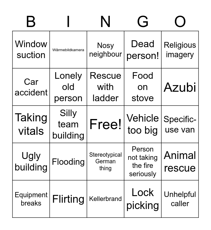 This bingo card has a free space and 40 words: Indestructible door, Taking vitals, Burning rubbish, Lonely old person, Flirting, Stereotypical German thing, Rescue with ladder, Neue Vokabel, Religious imagery, Ugly building, Silly team building, Dead person!, Unhelpful caller, Specific-use van, Vehicle too big, Flooding, Bored police officers, Window suction, Fun balcony decor, Nosy neighbour, Animal rescue, Lock picking, Food on stove, Car accident, Person falls down, Swearing, Unnecessary destruction, Kindergarten, Electrical fire, Car fire, Fuel fire, Equipment breaks, Improvisation, Person not taking the fire seriously, Azubi, Kellerbrand, Training exercise, Power tools, Wärmebildkamera and Blackout.