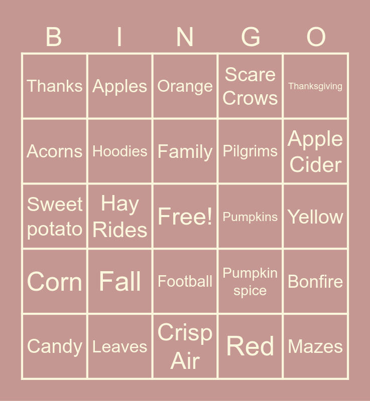 This bingo card has a free space and 24 words: Fall, Leaves, Family, Candy, Thanksgiving, Thanks, Acorns, Apples, Pumpkins, Football, Pilgrims, Sweet potato, Pumpkin spice, Bonfire, Hoodies, Red, Yellow, Orange, Apple Cider, Hay Rides, Mazes, Corn, Scare Crows and Crisp Air.