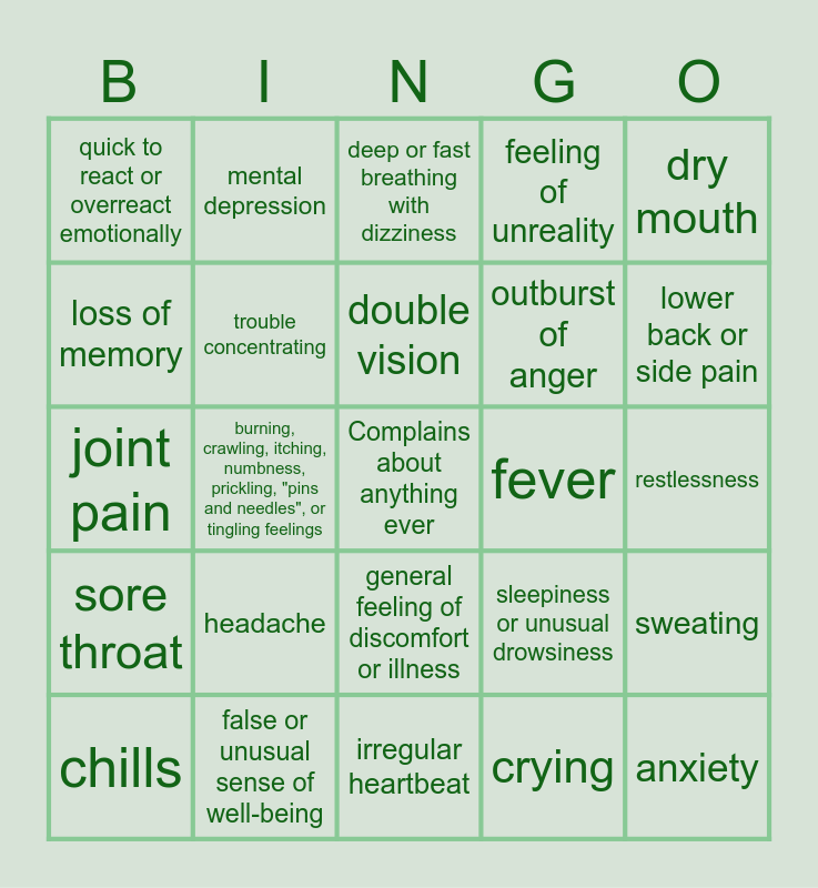 This bingo card has a free space and 44 words: Aggressive or angry, anxiety, change in personality, chills, cough, crying, deep or fast breathing with dizziness, delusions of persecution, mistrust, suspiciousness, or combativeness, dry mouth, false or unusual sense of well-being, feeling of unreality, fever, general feeling of discomfort or illness, headache, hoarseness, irregular heartbeat, muscle aches and pains, joint pain, loss of appetite, lower back or side pain, mental depression, nausea, numbness of the feet, hands, and around the mouth, quick to react or overreact emotionally, rapidly changing moods, restlessness, sense of detachment from self or body, shaking/ Shivering, sleepiness or unusual drowsiness, sore throat, stuffy or runny nose, sweating, trouble sleeping, unusual tiredness or weakness, burning, crawling, itching, numbness, prickling, "pins and needles", or tingling feelings, chest tightness, clumsiness or unsteadiness, dizziness or lightheadedness, double vision, loss of memory, outburst of anger, pain or tenderness around the eyes and cheekbones, trouble concentrating and unsteadiness, trembling, or other problems with muscle control or coordination.