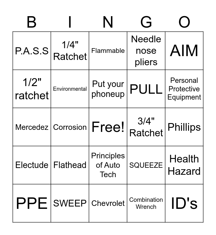 This bingo card has a free space and 24 words: PPE, Flathead, Put your phoneup, Combination Wrench, AIM, P.A.S.S, 1/4" Ratchet, Flammable, 3/4" Ratchet, Phillips, Mercedez, Environmental, SQUEEZE, Health Hazard, 1/2" ratchet, SWEEP, Chevrolet, Needle nose pliers, Personal Protective Equipment, Electude, Corrosion, Principles of Auto Tech, PULL and ID's.
