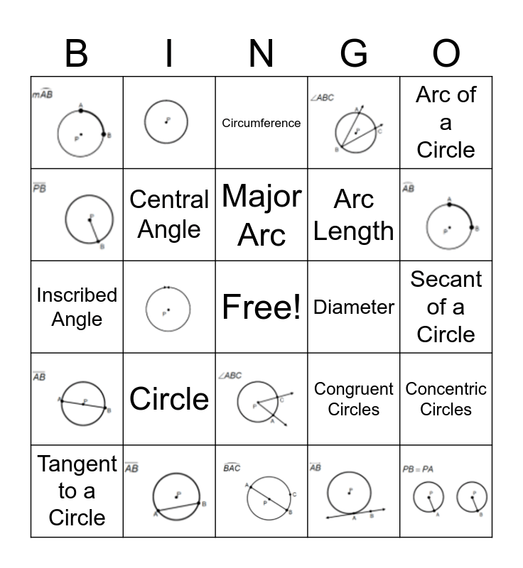 This bingo card has 16 images, a free space and 16 words: Chord, Diameter, Secant of a Circle, Tangent to a Circle, Circle, Radius, Congruent Circles, Concentric Circles, Inscribed Angle, Central Angle, Circumference, Arc Length, Arc of a Circle, Semicircle, Minor Arc and Major Arc.