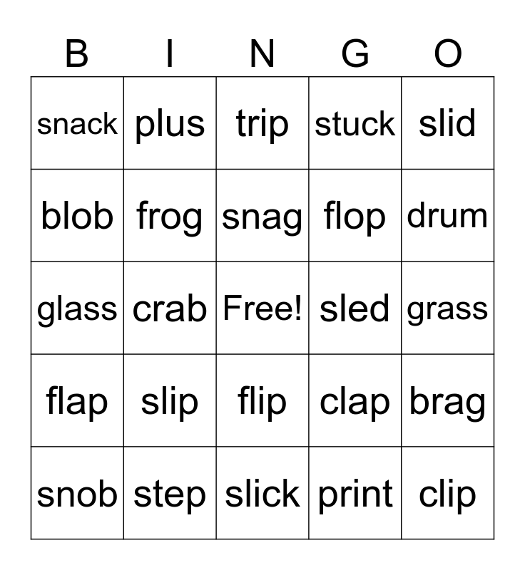 This bingo card has a free space and 24 words: slip, step, snag, snob, slid, snack, blob, plus, sled, flip, flop, glass, clap, brag, frog, print, grass, trip, drum, crab, clip, flap, stuck and slick.