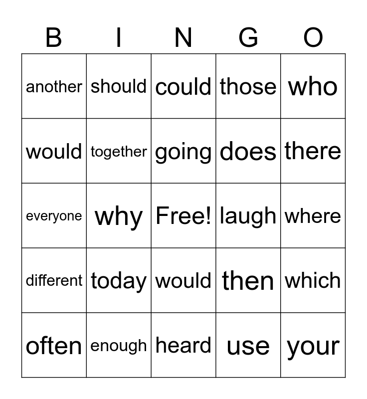 This bingo card has a free space and 42 words: around, going, walk, today, use, which, your, sign, could, would, where, there, why, who, when, then, they, everyone, together, should, would, saw, was, another, people, again, does, under, done, down, through, different, together, heard, thought, often, enough, laugh, read, these, those and sure.