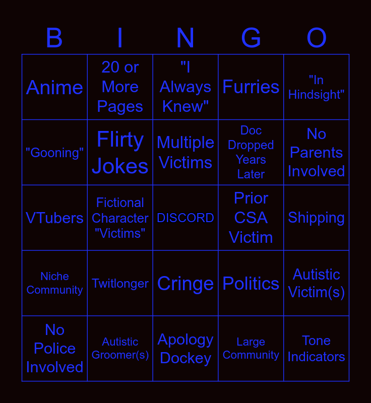 This bingo card has a free space and 24 words: Twitlonger, Autistic Groomer(s), Multiple Victims, No Police Involved, "In Hindsight", Anime, "Gooning", 20 or More Pages, Prior CSA Victim, Cringe, Doc Dropped Years Later, VTubers, Politics, Autistic Victim(s), Flirty Jokes, Large Community, Shipping, "I Always Knew", No Parents Involved, Fictional Character "Victims", Tone Indicators, Niche Community, Furries and Apology Dockey.