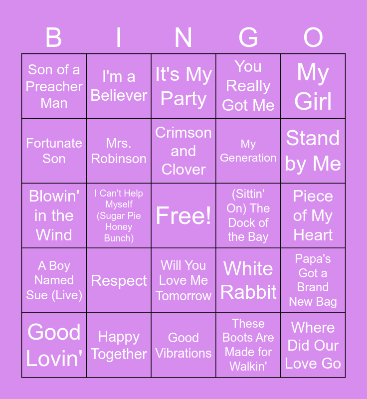 This bingo card has a free space and 50 words: Hey Jude, Where Did Our Love Go, Like a Rolling Stone, Good Vibrations, Respect, (I Can't Get No) Satisfaction, I'm a Believer, Suspicious Minds, Fortunate Son, I Heard It Through the Grapevine, Mrs. Robinson, You Really Got Me, Papa's Got a Brand New Bag, White Rabbit, Light My Fire, Born to Be Wild, Crimson and Clover, (Sittin' On) The Dock of the Bay, Sugar, Sugar, My Girl, I Can't Help Myself (Sugar Pie Honey Bunch), These Boots Are Made for Walkin', Son of a Preacher Man, My Generation, Everyday People, Wonderful World, Stand by Me, Oh, Pretty Woman, It's My Party, Will You Love Me Tomorrow, Sherry, Dancing in the Street, Higher and Higher, You Keep Me Hangin' On, Happy Together, San Francisco (Be Sure to Wear Flowers in Your Hair), Wichita Lineman, The Weight, Whole Lotta Love, Piece of My Heart, Nights in White Satin, I Got You Babe, A Whiter Shade of Pale, Mack the Knife, Good Lovin', Blowin' in the Wind, Walk On By, Groovin', A Boy Named Sue (Live) and Aquarius/Let the Sunshine In.