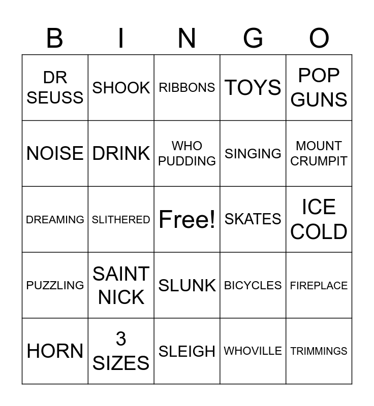 This bingo card has a free space and 95 words: GRINCH, MAX, WHOVILLE, CINDYLOU, MARTHA MAY, CHEERMEISTER, HEART, 3 SIZES, GREEN, WHO HASH, CHRISTMAS, STOLE, ROAST BEAST, WHO PUDDING, SANTY CLAUSE, DR SEUSS, MOUNT CRUMPIT, WHOS, SHOES, MISTLETOE, STOCKINGS, SNARLED, SNEER, GROWLED, TOYS, NOISE, FEAST, SINGING, AWFUL IDEA, TRICK, SAINT NICK, COAT, HAT, REINDEER, HORN, BAGS, SLEIGH, SNOOZE, DREAMING, CHIMNEY, FIREPLACE, SLITHERED, SLUNK, POP GUNS, BICYCLES, SKATES, DRUMS, POPCORN, PLUMS, CHECKERBOARDS, ICEBOX, FLASH, GLEE, DOVE, WATER, WHY, SLICK, QUICK, LIGHT, WORKSHOP, DRINK, FIRE, LOG, HOOKS, WIRE, CRUMB, MOUSE, DAWN, RIBBONS, WRAPPINGS, TAGS, TINSEL, TRIMMINGS, TRAPPINGS, TIPTOP, HUMMING, BOOHOO, SNOW, GROW, SHOOK, SURPRISE, SHOCKING, TALL, SMALL, ICE COLD, PUZZLING, SORE, THOUGHT, STORE, TIGHT, MORNING, LIGHT, FOOD, TOYS and CARVED.