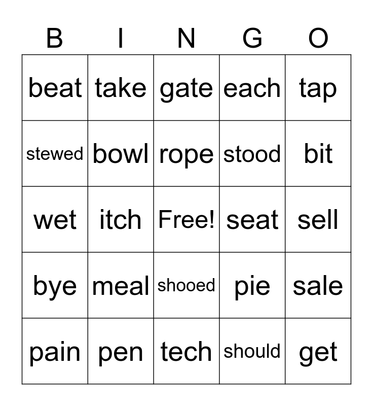This bingo card has a free space and 36 words: pear, bear, pole, bowl, pie, bye, rope, robe, tap, tab, itch, each, sit, seat, bit, beat, mill, meal, get, gate, sell, sale, pen, pain, tech, take, wet, wait, stood, stewed, could, cooed, should, shooed, hook and hoop.