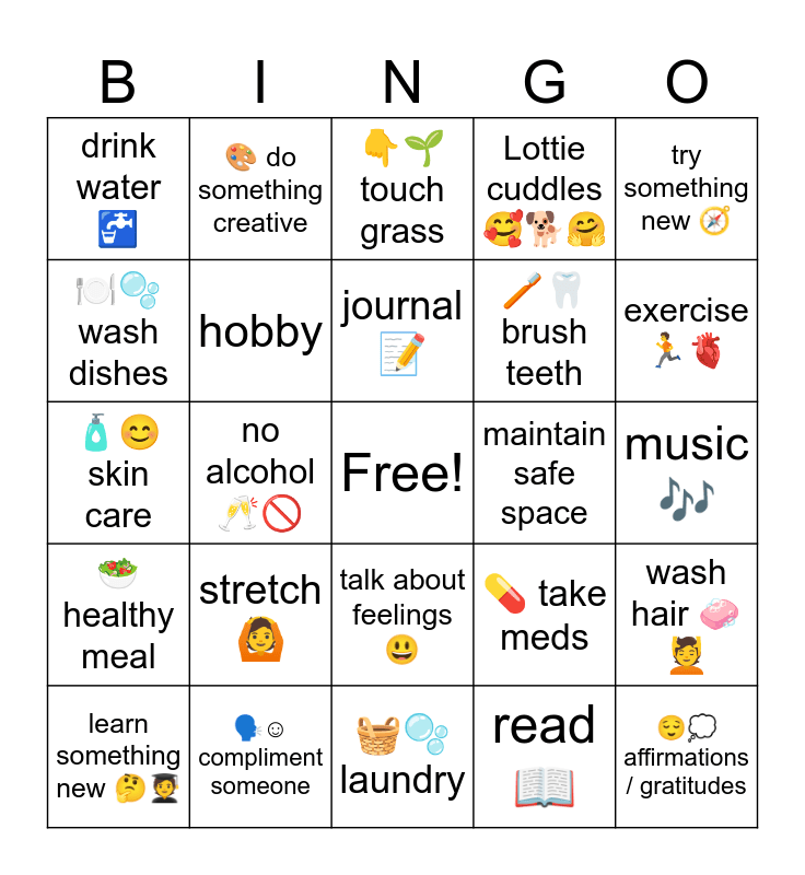 This bingo card has a free space and 27 words: π take meds, π§Όπ§ shower, πͺ₯π¦· brush teeth, π§Ίπ«§ laundry, π½οΈπ«§ wash dishes, ππ± touch grass, π¨ do something creative, π₯ healthy meal, maintain safe space, wash hair π§Όπ, π§΄π skin care, Lottie cuddles π₯°ππ€, learn something new π€π§βπ, π£οΈβΊοΈ compliment someone, exerciseππ«, 8+ hours π€, hobby, journalπ, stretchπ, drink waterπ°, music πΆ, read π, no alcoholπ₯π«, ππ affirmations / gratitudes, talk about feelings π, try something new π§ and be proud of yourself π.