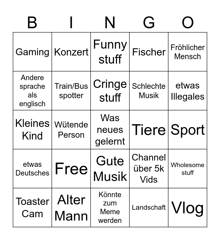 This bingo card has a free space and 24 words: Free, Alter Mann, Cringe stuff, Toaster Cam, Fröhlicher Mensch, Gaming, Andere sprache als englisch, Konzert, Tiere, Gute Musik, Schlechte Musik, Kleines Kind, Channel über 5k Vids, Wholesome stuff, Train/Bus spotter, Landschaft, Sport, Funny stuff, etwas Illegales, Wütende Person, Vlog, etwas Deutsches, Fischer and Könnte zum Meme werden.