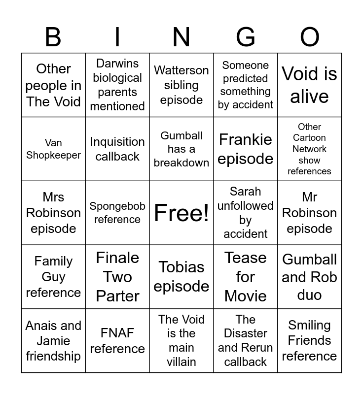 This bingo card has a free space and 24 words: Finale Two Parter, FNAF reference, Gumball has a breakdown, Anais and Jamie friendship, Void is alive, Other people in The Void, Van Shopkeeper, Darwins biological parents mentioned, Sarah unfollowed by accident, Tobias episode, Frankie episode, Mrs Robinson episode, Tease for Movie, Gumball and Rob duo, Inquisition callback, The Disaster and Rerun callback, Mr Robinson episode, Watterson sibling episode, Other Cartoon Network show references, Spongebob reference, Smiling Friends reference, Family Guy reference, Someone predicted something by accident and The Void is the main villain.