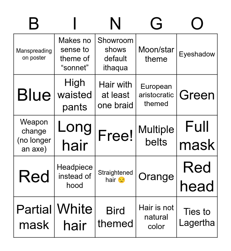This bingo card has a free space and 24 words: Headpiece instead of hood, White hair, Hair with at least one braid, Partial mask, Eyeshadow, Manspreading on poster, Blue, Makes no sense to theme of “sonnet”, Multiple belts, Straightened hair 😒, European aristocratic themed, Weapon change (no longer an axe), Orange, Red head, High waisted pants, Hair is not natural color, Full mask, Showroom shows default ithaqua, Green, Long hair, Ties to Lagertha, Red, Moon/star theme and Bird themed.