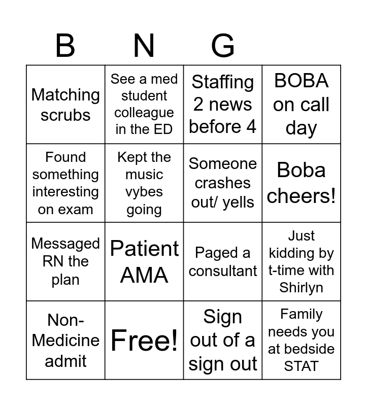 This bingo card has 25 words: Bread and butter patient, More than 2 family members in the room, Boba cheers!, Taught the residents something, Found something interesting on exam, Matching scrubs, Kept the music vybes going, See a med student colleague in the ED, Free!, Finished new H&P note by 7 PM, Messaged RN the plan, Paged a consultant, Used open evidence, Attending/ senior brings snacks/ dinner, Someone crashes out/ yells, Did 10 UWorld Questions on call day, Sign out of a sign out, Staffing 2 news before 4, Patient AMA, Just kidding by t-time with Shirlyn, Non-Medicine admit, Signed old notes by 2 PM, Family needs you at bedside STAT, BOBA on call day and "That was not on my bingo card".