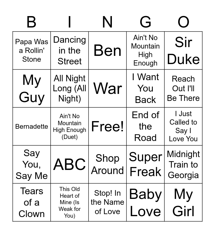 This bingo card has a free space and 50 words: Signed, Sealed, Delivered I'm Yours, My Girl, I Heard It Through the Grapevine, Stop! In the Name of Love, ABC, The Tracks of My Tears, Dancing in the Street, I Can't Help Myself (Sugar Pie Honey Bunch), My Guy, Brick House, All Night Long (All Night), Ain't No Mountain High Enough, Midnight Train to Georgia, Super Freak, Shotgun, Please Mr. Postman, War, End of the Road, Do You Love Me, Sir Duke, Ain't No Mountain High Enough (Duet), Baby Love, Papa Was a Rollin' Stone, I Want You Back, Cruisin', Heat Wave, Reach Out I'll Be There, Love Child, Ben, Shop Around, What Becomes of the Brokenhearted, Get Ready, Square Biz, Give It To Me Baby, This Old Heart of Mine (Is Weak for You), I Heard It Through the Grapevine, Needle in a Haystack, Baby, I'm For Real, Rhythm of the Night, I Just Called to Say I Love You, Ain't Too Proud to Beg, What's Going On, Where Did Our Love Go, The Love You Save, Tears of a Clown, Bernadette, I'm Coming Out, Don't Mess with Bill, Say You, Say Me and Easy.