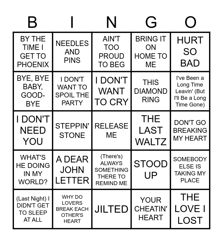 This bingo card has a free space and 79 words: 7-ROOMS OF GLOOM, AFTER YOU'RE GONE, AIN'T TOO PROUD TO BEG, ALL ALONE AM I, ANOTHER GIRL, BAND OF GOLD, BANG BANG (My Baby Shot Me Down), BITS AND PIECES, BLACK IS BLACK, BLUE EYES CRYING IN THE RAIN, BORN TO LOSE, BREAKING UP IS HARD TO DO, BRING IT ON HOME TO ME, BY THE TIME I GET TO PHOENIX, BYE BYE LOVE, BYE, BYE BABY, GOOD-BYE, A CHURCH, A COURTROOM, THEN GOODBYE, A DEAR JOHN LETTER, DON'T BREAK THE HEART THAT LOVES YOU, DON'T GO BREAKING MY HEART, HE WIL BREAK YOUR HEART, HURT SO BAD, I DON'T NEED YOU, I DON'T WANT TO CRY, I DON'T WANT TO SPOIL THE PARTY, I WANNA BE AROUND, IF I CAN'T HAVE YOU, IF YOU SHOULD SAY GOODBYE, IT'S TOO LATE, I'LL NEVER SMILE AGAIN, I've Been a Long Time Leavin' (But I'll Be a Long Time Gone), I'VE PASSED THIS WAY BEFORE, JILTED, KING OF A DRAG, (Last Night) I DIDN'T GET TO SLEEP AT ALL, THE LAST WALTZ, LET ME GO LOVER, THE LETTER, LIES, THE LOVE I LOST, MAKE IT EASY ON YOURSELF, MAKE THE WORLD GO AWAY, MANEATER, A MUST TO AVOID, MY OLD FLAME, NEEDLES AND PINS, ONLY LOVE CAN BREAK A HEART, ROSES ARE RED, SINCE I LOST MY BABY, SOFTLY AS I LEAVE YOU, SOMEBODY ELSE IS TAKING MY PLACE, STEPPIN' STONE, STOOD UP, (Sweet Sweet Baby) SINCE YOU'VE BEEN GONE, TAKE GOOD CARE OF MY BABY, TEARS ON MY PILLOW, TENNESSEE WALTZ, THERE GOES MY BABY, THERE GOES MY EVERYTHING, (There's) ALWAYS SOMETHING THERE TO REMIND ME, THIS DIAMOND RING, THIS TIME (We're Really Breaking Up), TOOT, TOOT, TOOTSIE (Good-Bye), TOWER OF STRENGTH, TRACKS OF MY TEARS, UNCHAIN MY HEART, USE TA BE MY GIRL, WALK RIGHT BACK, WHAT NOW MY LOVE, WHAT'S HE DOING IN MY WORLD?, WHY DO LOVERS BREAK EACH OTHER'S HEART, WINCHESTER CATHEDRAL, YOU CHEATED, YOU'LL LOSE A GOOD THING, YOU'LL NEVER FIND ANOTHER LOVE LIKE MINE, YOUR CHEATIN' HEART, YOU'RE BREAKING MY HEART, YOU'RE GONNA MISS ME and YOU'VE LOST THAT LOVIN' FEELIN'.