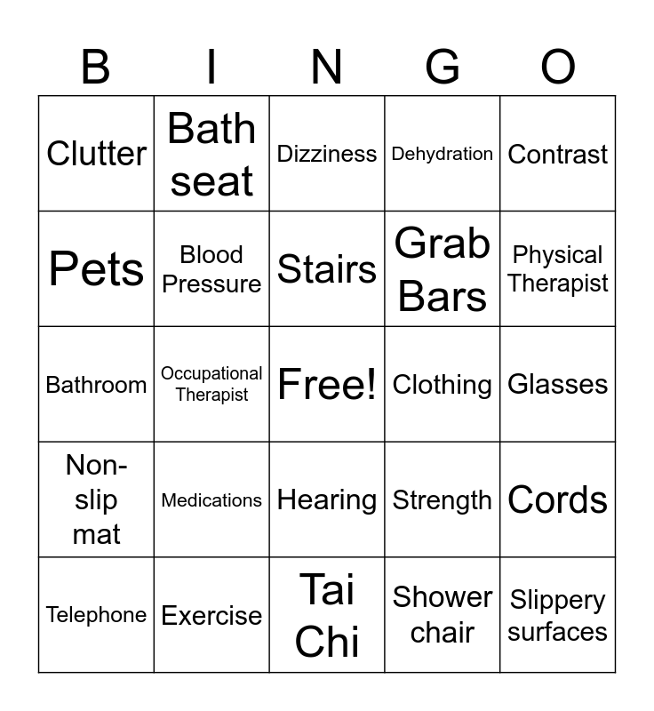 This bingo card has a free space and 24 words: Medications, Exercise, Stairs, Telephone, Contrast, Clutter, Pets, Bath seat, Clothing, Hearing, Grab Bars, Bathroom, Strength, Cords, Blood Pressure, Shower chair, Glasses, Dizziness, Physical Therapist, Occupational Therapist, Slippery surfaces, Non-slip mat, Dehydration and Tai Chi.
