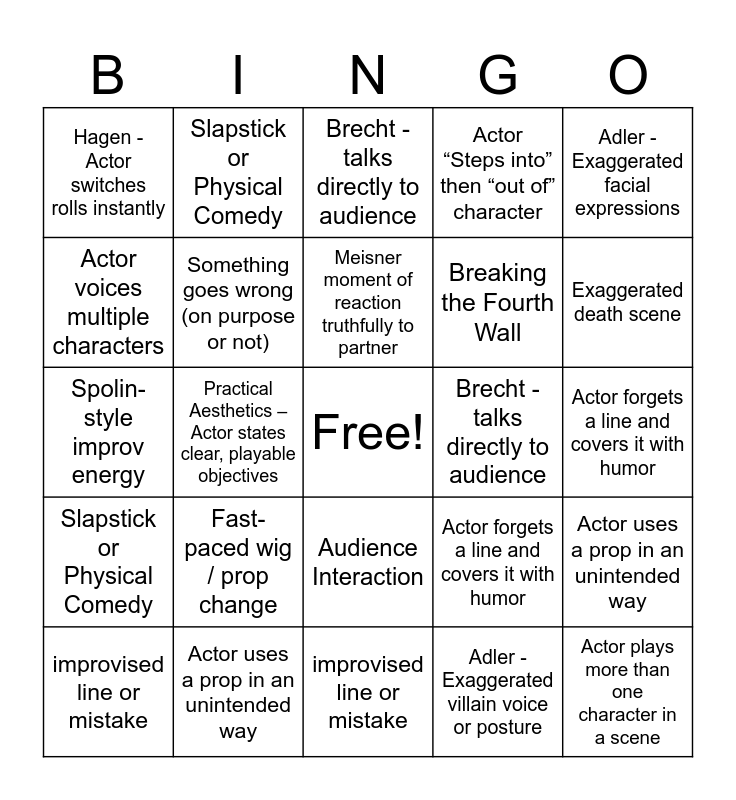 This bingo card has a free space and 47 words: Breaking the Fourth Wall, Actor plays more than one character in a scene, Exaggerated death scene, improvised line or mistake, Fast-paced wig / prop change, Audience Interaction, Slapstick or Physical Comedy, Over the top Shakespearean emotion, Actor voices multiple characters, Cross-Gender Casting, Something goes wrong (on purpose or not), Actor “Steps into” then “out of” character, Actor uses a prop in an unintended way, Actor forgets a line and covers it with humor, Chekhov-like big gesture, Stanislavski moment of real emotion, Meisner moment of reaction truthfully to partner, Brecht - talks directly to audience, Spolin-style improv energy, Adler - Exaggerated facial expressions, Practical Aesthetics – Actor states clear, playable objectives, Adler - Exaggerated villain voice or posture, Hagen - Actor switches rolls instantly, Breaking the Fourth Wall, Actor plays more than one character in a scene, Exaggerated death scene, improvised line or mistake, Fast-paced wig / prop change, Audience Interaction, Slapstick or Physical Comedy, Over the top Shakespearean emotion, Actor voices multiple characters, Cross-Gender Casting, Something goes wrong (on purpose or not), Actor “Steps into” then “out of” character, Actor uses a prop in an unintended way, Actor forgets a line and covers it with humor, Chekhov-like big gesture, Stanislavski moment of real emotion, Meisner: moment of reaction truthfully to partner, Meisner: use of repetition, Brecht - talks directly to audience, Spolin-style improv energy, Adler - Exaggerated facial expressions, Practical Aesthetics – Actor states clear, playable objectives, Adler - Exaggerated villain voice or posture and Hagen - Actor switches rolls instantly.