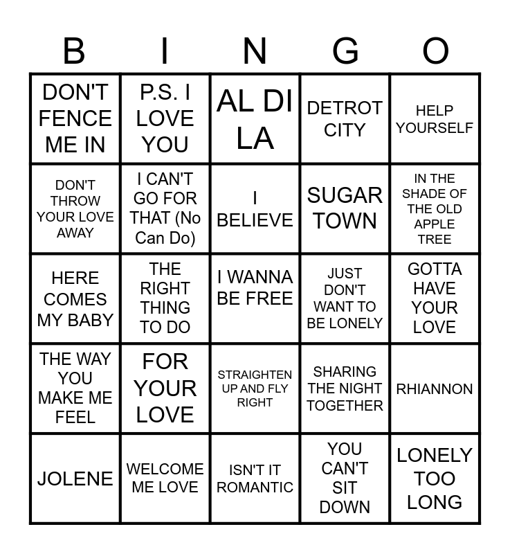 This bingo card has a free space and 79 words: 9 TO 5 (MORNING TRAIN), AFTER YOU'VE GONE, AL DI LA, ANY WAY YOU WANT IT, BECAUSE OF YOU, CALL ME MR. IN-BETWEEN, CAN'T TAKE MY EYES OFF OF YOU, CATCH US IF YOU CAN, COME RAIN OR COME SHINE, DARLING BE HOME SOON, DARLING FOREVER, DEDICATED TO THE ONE I LOVE, DETROT CITY, DON'T FENCE ME IN, DON'T JUST STAND THERE, DON'T THROW YOUR LOVE AWAY, EVEN NOW, FOR YOUR LOVE, FUNKY BROADWAY, GOTTA HAVE YOUR LOVE, HAVE YOU SEEN YOUR MOTHER, BABY, HELP YOURSELF, HERE COMES MY BABY, I BELIEVE, I CAN'T GO FOR THAT (No Can Do), IF I WERE A CARPENTER, I'M WALKING, I'M YOUR PUPPET, IN MY LIFE, IN THE MIDNIGHT HOUR, IN THE SHADE OF THE OLD APPLE TREE, AN INNOCENT MAN, ISN'T IT ROMANTIC, IT'S A SHAME, JOLENE, JUST DON'T WANT TO BE LONELY, LET THE MUSIC PLAY, LISTEN PEOPLE, LITTLE DEUCE COUP, LONELY TOO LONG, LUCILLE, MA BELLE AMI, MUSKAT RAMBLE, MY BABY LOVES LOVIN', MY ROMANCE, P.S. I LOVE YOU, PHILADELPHIA FREEDOM, PLEASE DON'T STOP THE MUSIC, REFLECTIONS OF MY LIFE, REMEMBER ME BABY, RHIANNON, THE RIGHT THING TO DO, SHARING THE NIGHT TOGETHER, SHE'S MY GIRL, SOMEONE LIKE YOU, SOMETHIN' STUPID, SOMEWHERE THERE'S A SOMEONE, SOPHISTICATED LADY, STEP BY STEP, STRAIGHTEN UP AND FLY RIGHT, SUGAR TOWN, SWEETS FOR MY SWEET, TELL HIM, THERE! I'VE SAID IT AGAIN, THEY CAN'T TAKE THAT AWAY FROM ME, THOSE LAZY, HAZY, CRAZY DAYS OF SUMMER, TIME, THE TIMES THEY ARE A-CHANGIN', WATCH THE FLOWERS GROW, THE WAY YOU MAKE ME FEEL, WELCOME ME LOVE, WELCOME TO MY WORLD, WITH A LITTLE LUCK, WORKIN' ON A GROOVY THING, YOU ARE MY DESTINY, YOU CAN'T SIT DOWN, YOU RAISE ME UP, YOU WERE MADE FOR ME and (YOU'RE) HAVING MY BABY.