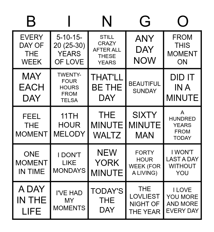 This bingo card has a free space and 72 words: 5 MONTHS, 2 WEEKS, 2 DAYS, 5-10-15-20 (25-30) YEARS OF LOVE, 11TH HOUR MELODY, 2000 LIGHT YEARS FROM HOME, AFTER HOURS, ANOTHER SATURDAY NIGHT, ANY DAY NOW, AT THIS MOMENT, BEAUTIFUL SUNDAY, BLACK FRIDAY, A DAY IN THE LIFE, DAY IN-DAY OUT, DID IT IN A MINUTE, EVERY DAY OF THE WEEK, EV'RY DAY OF MY LIFE, FEEL THE MOMENT, FORTY HOUR WEEK (FOR A LIVING), FROM THIS MOMENT ON, GOLDEN MOMENTS, A HUNDRED YEARS FROM TODAY, I DON'T LIKE MONDAYS, I LOVE YOU MORE AND MORE EVERY DAY, I WON'T LAST A DAY WITHOUT YOU, I'D WAIT A MILLION YEARS, IN A MOMENT, IN THE MIDNIGHT HOUR, IN THE WEE SMALL HOURS OF THE EVENING, IN THE YEAR 2525, IT ONLY TAKES A MINUTE, IT WAS A VERY GOOD YEAR, I'VE HAD MY MOMENTS, JUST WAIT A MILLION YEARS, LAZY DAY, LONELY WEEKENDS, THE LOVLIEST NIGHT OF THE YEAR, MAGIC MOMENTS, THE MOMENT OF TRUTH, MOMENTS TO REMEMBER, MAY EACH DAY, MY SHINING HOUR, NEW YORK MINUTE, NIGHT WE CALLED IT A DAY, OH HAPPY DAY, ON A CLEAR DAY, ONE FINE DAY, ONE MOMENT IN TIME, OUR DAY WILL COME, RUBY TUESDAY, SATURDAY NIGHT (Is the Loneliest Night of the Year), SCHOOL DAY, SEVEN LONELY DAYS, SEVEN YEARS, SIX NIGHTS A WEEK, SIXTY MINUTE MAN, SOME DAY, SOME DAY WE'RE GONNA LOVE AGAIN, STILL CRAZY AFTER ALL THESE YEARS, THAT'LL BE THE DAY, THIS MAGIC MOMENT, THIS MOMENT IN TIME, THIS YEAR'S LOVE, THOUSAND YEARS, THROUGH THE YEARS, TODAY'S THE DAY, TURN-DOWN DAY, TWELVE MONTHS A YEAR, TWENTY-FOUR HOURS FROM TELSA, WEEKEND IN NEW ENGLAND, WHERE WERE YOU ON OUR WEDDING DAY, WILD WEEKEND, YEAR OF THE CAT and YEARS FROM NOW.