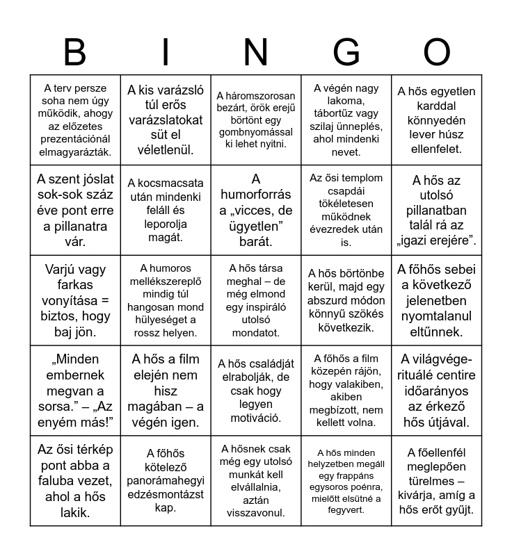 This bingo card has a free space and 24 words: A hős a film elején nem hisz magában – a végén igen., A főhős kötelező panorámahegyi edzésmontázst kap., A humorforrás a „vicces, de ügyetlen” barát., Az ősi térkép pont abba a faluba vezet, ahol a hős lakik., A hős egyetlen karddal könnyedén lever húsz ellenfelet., A terv persze soha nem úgy működik, ahogy az előzetes prezentációnál elmagyarázták., A szent jóslat sok-sok száz éve pont erre a pillanatra vár., A kis varázsló túl erős varázslatokat süt el véletlenül., A hős börtönbe kerül, majd egy abszurd módon könnyű szökés következik., A hős családját elrabolják, de csak hogy legyen motiváció., Az ősi templom csapdái tökéletesen működnek évezredek után is., Varjú vagy farkas vonyítása = biztos, hogy baj jön., A főhős a film közepén rájön, hogy valakiben, akiben megbízott, nem kellett volna., A világvége-rituálé centire időarányos az érkező hős útjával., A kocsmacsata után mindenki feláll és leporolja magát., A hős minden helyzetben megáll egy frappáns egysoros poénra, mielőtt elsütné a fegyvert., A főhős sebei a következő jelenetben nyomtalanul eltűnnek., A háromszorosan bezárt, örök erejű börtönt egy gombnyomással ki lehet nyitni., A hős az utolsó pillanatban talál rá az „igazi erejére”., A humoros mellékszereplő mindig túl hangosan mond hülyeséget a rossz helyen., A főellenfél meglepően türelmes – kivárja, amíg a hős erőt gyűjt., „Minden embernek megvan a sorsa.” – „Az enyém más!”, A végén nagy lakoma, tábortűz vagy szilaj ünneplés, ahol mindenki nevet. and A hősnek csak még egy utolsó munkát kell elvállalnia, aztán visszavonul..