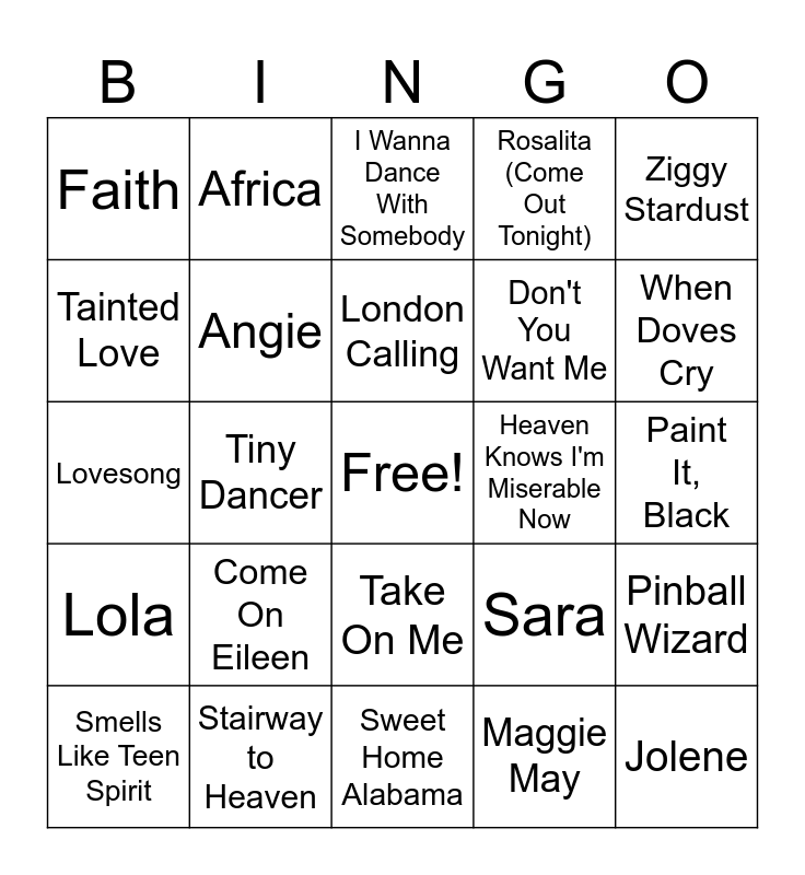 This bingo card has a free space and 50 words: Hey Jude, Jolene, Billie Jean, Sweet Home Alabama, Come On Eileen, Brown Eyed Girl, Africa, Roxanne, Tainted Love, My Sharona, Angie, Rosalita (Come Out Tonight), Pinball Wizard, Sara, Lay Lady Lay, Losing My Religion, London Calling, Heaven Knows I'm Miserable Now, Just Like Heaven, Ziggy Stardust, Tiny Dancer, Maggie May, Faith, Don't You Want Me, White Wedding, Walk Like an Egyptian, When Doves Cry, Like a Prayer, I Wanna Dance With Somebody, Take On Me, Girls Just Want to Have Fun, Bohemian Rhapsody, Heroes, All Along the Watchtower, Stairway to Heaven, With or Without You, Respect, Yesterday, Hound Dog, Paint It, Black, Like a Rolling Stone, Superstition, Material Girl, Kiss, Smells Like Teen Spirit, Lovesong, The Queen Is Dead, Should I Stay or Should I Go, Lola and The House of the Rising Sun.