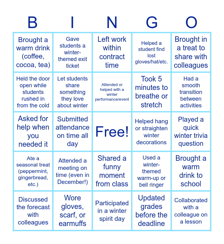This bingo card has a free space and 73 words: Wore a cozy sweater, Wore winter boots or fuzzy socks, Brought a warm drink (coffee, cocoa, tea), Used a winter-themed mug, Played winter or holiday music during planning, Displayed a winter decoration on your desk, Ate a seasonal treat (peppermint, gingerbread, etc.), Shared your favorite winter movie or song with a colleague, Used a winter-themed warm-up or bell ringer, Incorporated a snow or ice analogy into a lesson, Did a winter-themed brain break, Used a snowflake, hot cocoa, or mitten emoji in your slides, Let students share something they love about winter, Played a quick winter trivia question, Used a “snowball toss” review activity, Gave students a winter-themed exit ticket, Participated in a winter spirit day, Held the door open while students rushed in from the cold, Complimented someone’s festive outfit, Helped hang or straighten winter decorations, Attended or helped with a winter performance/event, Helped a student find lost gloves/hat/etc., Brought in a treat to share with colleagues, Made a joke about the weather (“Layer up, it’s Colorado…”), Discussed the forecast with colleagues, Spotted at least 3 students wearing shorts in 30-degree weather, Noticed someone humming a winter song, Heard (or said) “I can’t believe it’s already December!”, Started your car early or scraped ice off windows, Took a moment to enjoy a sunrise or sunset, Wore gloves, scarf, or earmuffs, Saw a student’s winter-themed drawing, Brought in tissues or lotion to fight the dry air, Talked about winter break plans, Submitted attendance on time all day, Greeted students at the door, Called/emailed a family with good news, Gave specific positive feedback to 5 students, Collaborated with a colleague on a lesson, Posted learning targets/agenda clearly, Updated grades before the deadline, Attended a meeting on time (even in December!), Completed required paperwork early, Tried a new classroom strategy, Drank a full bottle of water during the day, Took 5 minutes to breathe or stretch, Left work within contract time, Did something kind for yourself after school, Completed one task you’ve been putting off, Asked for help when you needed it, Took a quick walk during planning, Held the door for someone, Participated in a spirit day, Took a photo in front of school decorations, Helped a student or colleague problem-solve, Wore holiday socks or a festive accessory, Played holiday music during planning, Shared a funny moment from class, A student made you laugh, A student taught you something, Class successfully followed directions the first time, A student asked a thoughtful question, Used a brain break or time-filler activity, Had a smooth transition between activities, Showed patience during a tough moment, Gave a compliment to 3 students, Cleaned one area of your workspace, Put your feet up for 2 minutes, Brought a warm drink to school, Helped a student get organized, Printed something before the copier broke, Found a missing pen/pencil that you actually needed and Finished your coffee while it was still warm (a miracle square!).