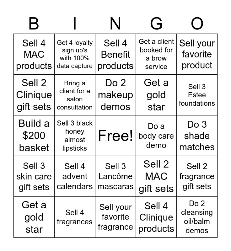 This bingo card has a free space and 24 words: Sell 4 advent calendars, Sell 4 fragrances, Do 2 makeup demos, Get a gold star, Sell your favorite product, Sell 4 MAC products, Sell 2 Clinique gift sets, Get 4 loyalty sign up's with 100% data capture, Do a body care demo, Sell 3 Lancôme mascaras, Get a gold star, Build a $200 basket, Sell 2 MAC gift sets, Sell 2 fragrance gift sets, Bring a client for a salon consultation, Sell 4 Clinique products, Do 3 shade matches, Sell 4 Benefit products, Sell 3 Estee foundations, Sell 3 black honey almost lipsticks, Do 2 cleansing oil/balm demos, Sell 3 skin care gift sets, Get a client booked for a brow service and Sell your favorite fragrance.