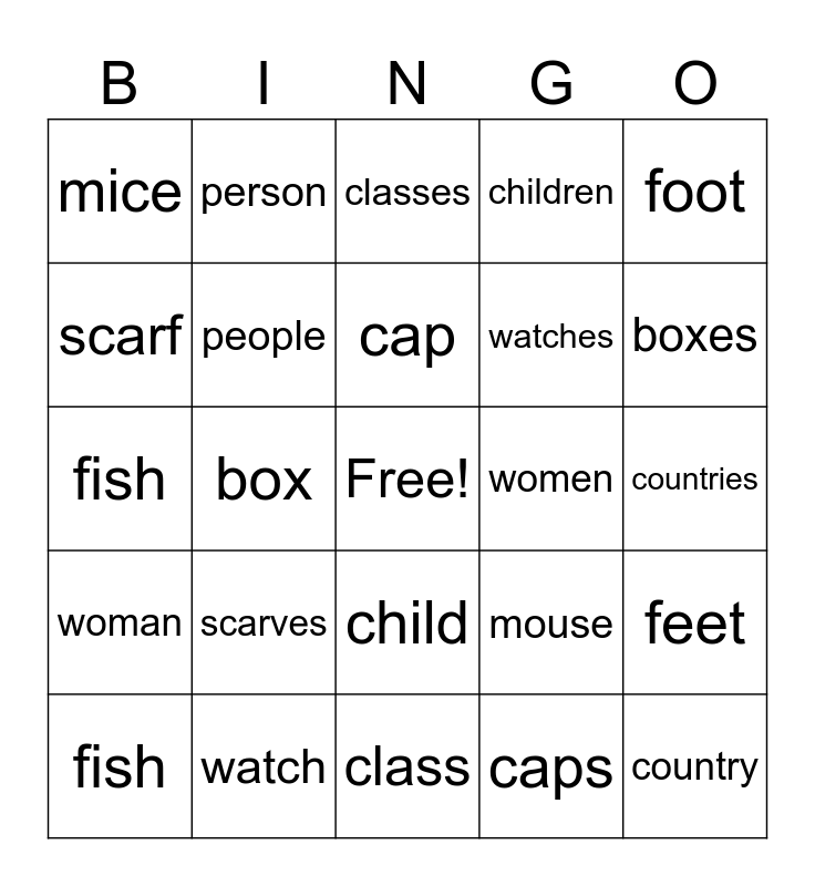 This bingo card has a free space and 24 words: scarves, watch, cap, fish, foot, mice, scarf, person, women, child, watches, fish, mouse, feet, people, caps, countries, classes, boxes, box, country, woman, children and class.