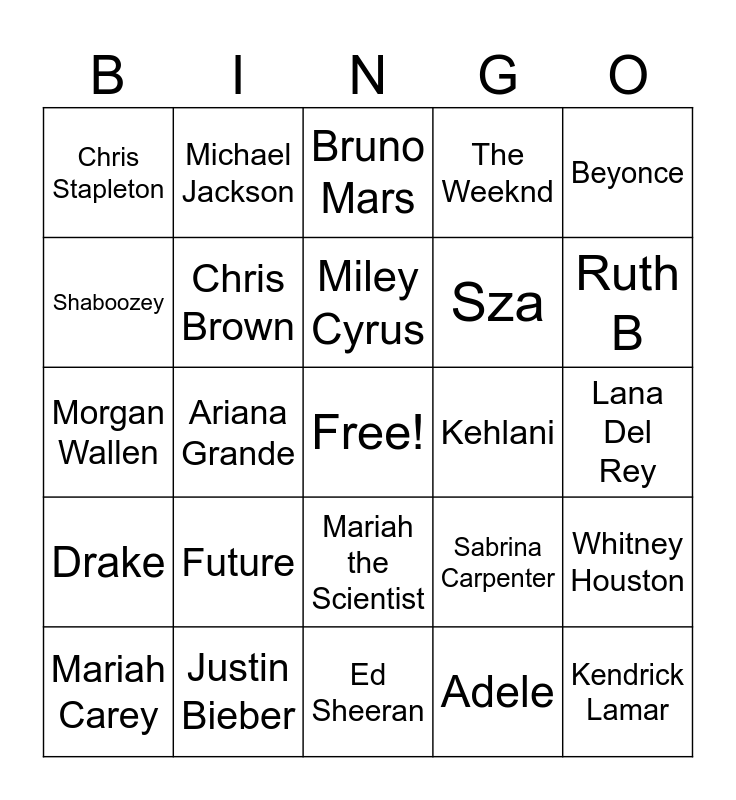 This bingo card has a free space and 32 words: Adele, Taylor Swift, Ariana Grande, Rod Wave, Drake, Chris Brown, Beyonce, Whitney Houston, Michael Jackson, Rihanna, Miley Cyrus, Bruno Mars, Ed Sheeran, Lil Baby, Kehlani, Nicki Minaj, Mariah Carey, Morgan Wallen, Mariah the Scientist, Future, Sabrina Carpenter, Billie Eilish, Lana Del Rey, Justin Bieber, Kendrick Lamar, The Weeknd, Sza, Shaboozey, Chris Stapleton, Ed Sheeran, Bad Bunny and Ruth B.