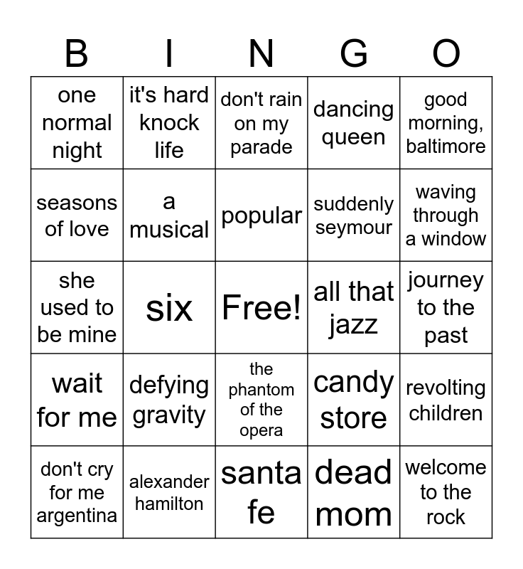 This bingo card has a free space and 24 words: defying gravity, alexander hamilton, popular, don't cry for me argentina, good morning, baltimore, one normal night, seasons of love, it's hard knock life, all that jazz, the phantom of the opera, suddenly seymour, she used to be mine, candy store, revolting children, a musical, dead mom, journey to the past, don't rain on my parade, waving through a window, six, welcome to the rock, wait for me, dancing queen and santa fe.
