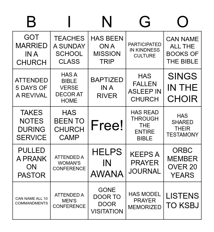 This bingo card has a free space and 24 words: ATTENDED A WOMAN'S CONFERENCE, ATTENDED A MEN'S CONFERENCE, BAPTIZED IN A RIVER, CAN NAME ALL 10 COMMANDMENTS, CAN NAME ALL THE BOOKS OF THE BIBLE, GOT MARRIED IN A CHURCH, ATTENDED 5 DAYS OF A REVIVAL, TEACHES A SUNDAY SCHOOL CLASS, HAS READ THROUGH THE ENTIRE BIBLE, HELPS IN AWANA, HAS FALLEN ASLEEP IN CHURCH, TAKES NOTES DURING SERVICE, KEEPS A PRAYER JOURNAL, ORBC MEMBER OVER 20 YEARS, HAS A BIBLE VERSE DECOR AT HOME, HAS MODEL PRAYER MEMORIZED, HAS SHARED THEIR TESTAMONY, HAS BEEN ON A MISSION TRIP, SINGS IN THE CHOIR, HAS BEEN TO CHURCH CAMP, LISTENS TO KSBJ, PULLED A PRANK ON PASTOR, PARTICIPATED IN KINDNESS CULTURE and GONE DOOR TO DOOR VISITATION.